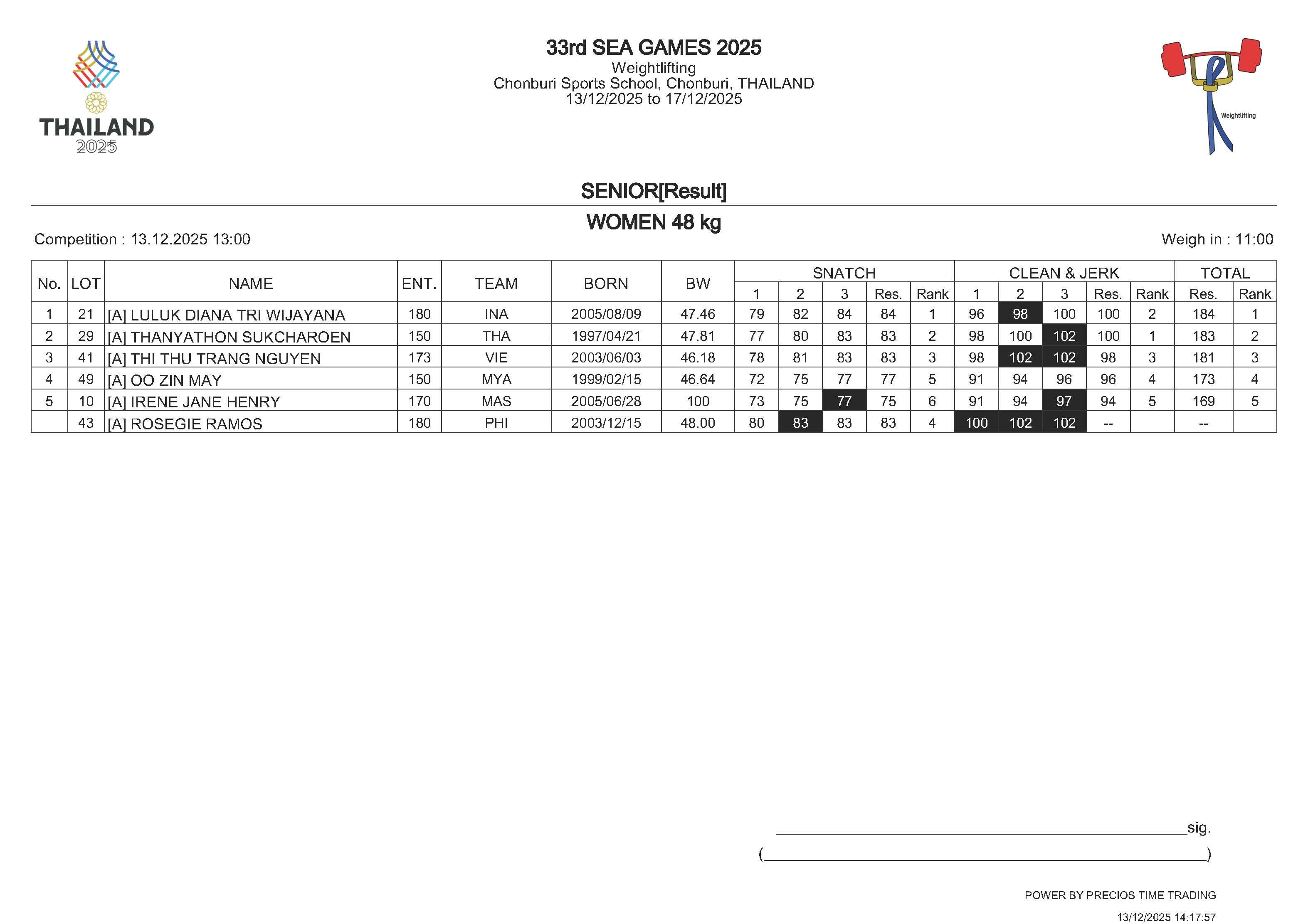 The first day of SEA Games started with Women 48kg and LULUK DIANA TRI WIJAYANA (INA) took the first Gold in this event with 184 kg in Totals. It’s just only 1kg from THANYATHON SUKCHAROEN (THA) who is the second place by 183kg and THI THU TRANG NGUYEN (VIE) won the Bronze for 181kg.