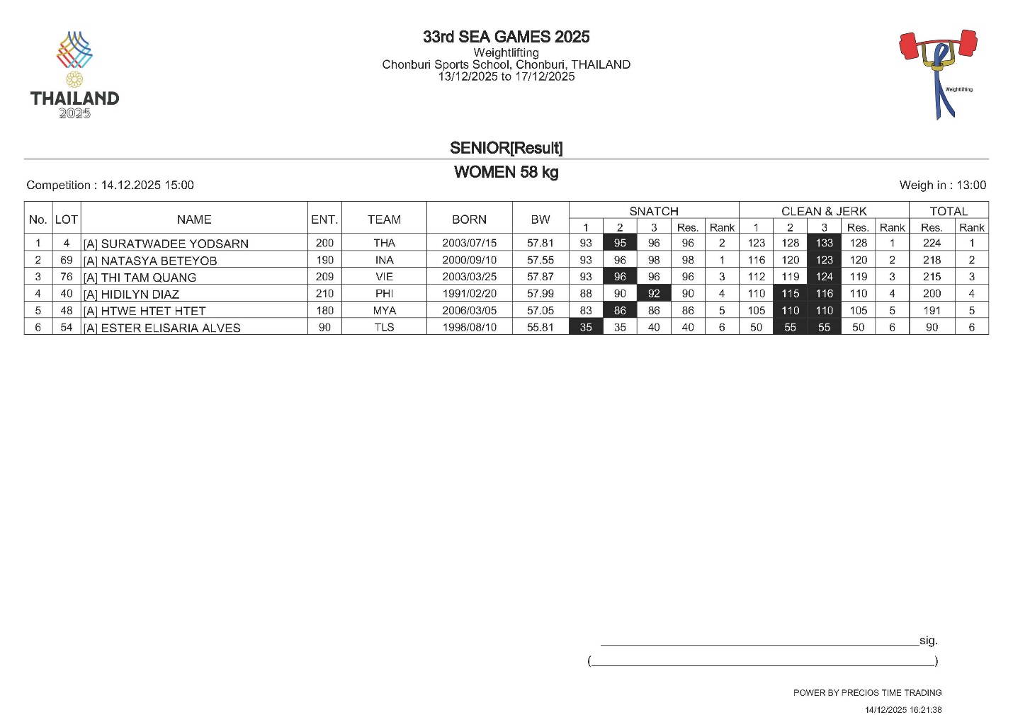 In Women 58kg, SURATWADEE YODSARN (THA), 2025 AWC Silver Medalist, showed her outstanding performance with 224 kg for the winner. NATASYA BETEYOB (INA), 2024 Tashkent Bronze Medalist, did good for the first place in Snatch, but finish with the second – 218 kg. THI TAM QUANG (VIE) lifted 215 kg to ended in the third accordingly.